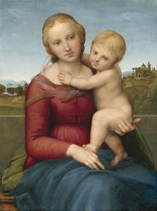 A Renaissance-style painting depicts a woman in a red dress holding a baby. The woman has a classical hairstyle and is looking down at the baby. The baby is naked and appears to be reaching up towards the woman's face. The background features a landscape with a building and trees, and the painting has a textured, aged appearance. | The Small Cowper Madonna, C. 1505 by Raphael Sanzio da Urbino | 6cf6781ba56732704ec91bfd0bd1f16ec27f00f97b8749ea502079e8c83b8b1d | 000720924652 | 0 | 0 | 58 | 11 | 0 | 0 | |