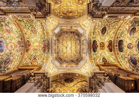 The first image shows an ornate ceiling with a central circular design surrounded by a series of smaller circular panels. Each panel features a different painting or fresco, depicting various scenes and figures. The ceiling is richly decorated with gold accents and intricate designs, creating a sense of grandeur and opulence. The image is well-lit, highlighting the details of the artwork and the architectural elements. | Bergamo, Italy - April 11, 2019: Santa Maria Maggiore Basilica Interior. The Basilica Of Santa Maria | e951083f37db8355bc409a9b28cddf9d2ec0d0d1d97d59b15257289b2f238aad | 000720924648 | 0 | 0 | 65 | 16 | 0 | 0 | |
