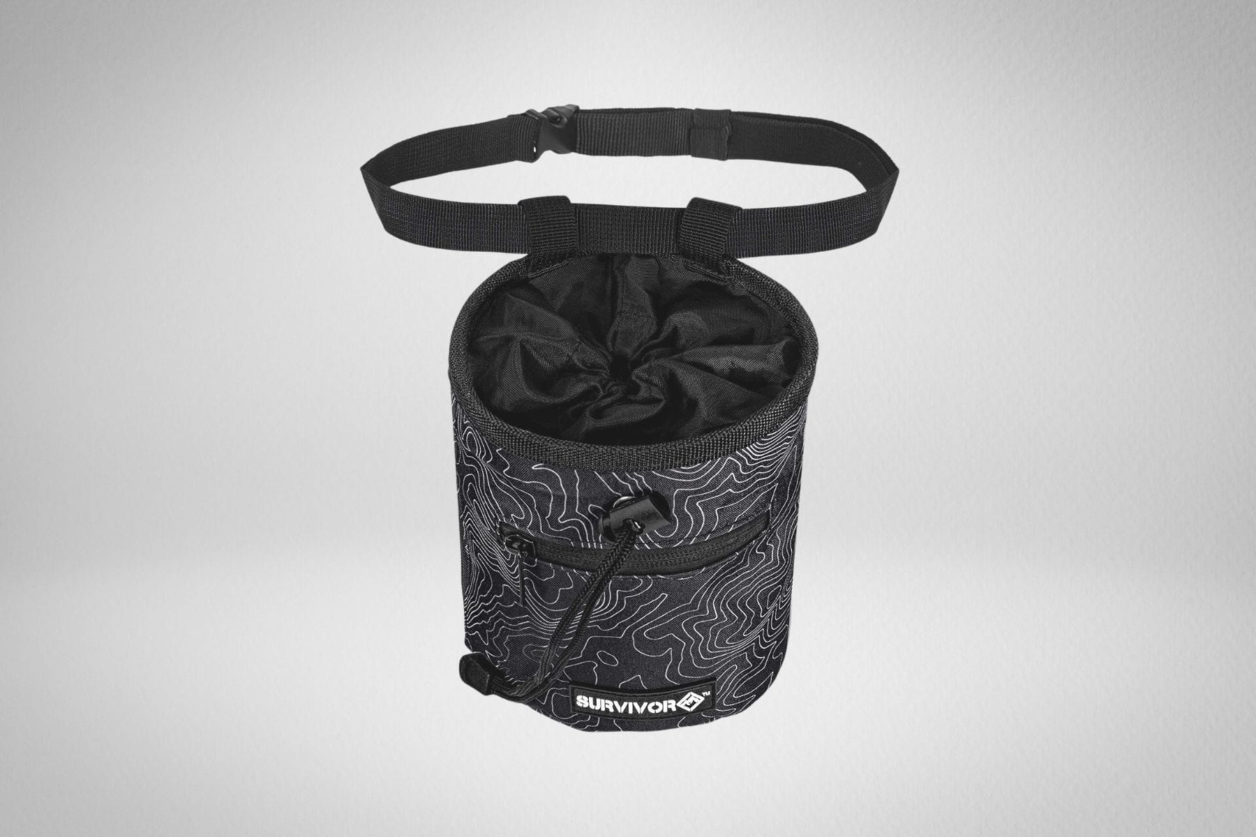 A black and white patterned water bottle with a black strap and a black cap is displayed against a white background. | Survivor Chalk Bag | e5672c3ffede2f75206796657dcc069ef280ee1cb3b6b0d63a578a408c79f71a | 000720924515 | 0 | 0 | 21 | 3 | 0 | 0 | |