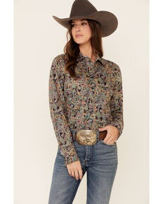 A woman is wearing a patterned shirt with a cowboy hat and a belt with a buckle. | Cinch Women's Multi Paisley Print Long Sleeve Western Shirt , Multi, hi-res | 6aecadcfed0619c94d6127247ddc9eaa82a6473da29cf400f299711db429abde | 000720924631 | 0 | 0 | 17 | 12 | 0 | 0 | |