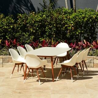 A modern dining set with a round glass table and six matching white chairs with wooden legs is placed on a tiled patio. The chairs have a sleek design with a curved backrest and a cushioned seat. The table has a wooden base and is surrounded by a variety of potted plants and a hedge in the background. | Amazonia Bonita White 9-piece Rectangular Patio Dining Set | 84051510225889669a63270dbce7e7c9aff971537f331326c76f64a09d2eb54e | 000720950755 | 0 | 0 | 58 | 8 | 0 | 0 | |