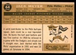 A vintage baseball card featuring a player named Jack Meyer. The card has a beige background with a green border and includes a cartoon illustration of the player in a baseball uniform. The card also contains text and statistics about Meyer's career, including his position as a pitcher and his team affiliations. | 1960 Topps #64 Jack Meyer Back Thumbnail | 1447f5a869a22745864130b8b7b0479a8a8f8ade1cf1faf7d8fdaf948faba878 | 000720950769 | 0 | 0 | 52 | 7 | 0 | 0 | |