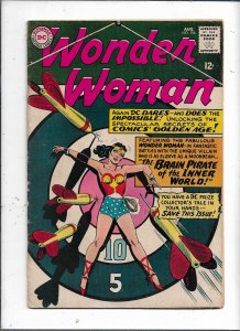 A vintage comic book cover featuring Wonder Woman, with a prominent image of the character in the center. She is depicted with a dynamic pose, holding a lasso and a shield, and surrounded by various missiles and a circular target. The cover has a green and pink color scheme with a title that reads 'WONDER WOMAN' in large, bold letters. The issue number is '5' and the cover is in good condition with some wear and tear around the edges. | Wonder Woman #156 (1965) VG | 8ed1a841893dd4a5fd498af8a3795c427281ff5f6ce3d335042694731abad947 | 000720950946 | 0 | 0 | 80 | 5 | 0 | 0 |
