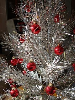 A silver metallic Christmas tree adorned with red ornaments and a golden star on top. | my vintage aluminum christmas tree | 57014ca5b042b751297a31932a7d83447b645aa7caac5c39f85d602f1658a3ba | 000720950815 | 0 | 0 | 15 | 5 | 0 | 0 | |