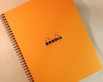 A yellow notebook with a spiral binding on the left side is open to a blank page. The cover of the notebook features a stylized black logo with the word 'Rhodia' in the center, surrounded by a mountain silhouette. The notebook is placed on a surface with a subtle texture, and the lighting casts a soft shadow to the right of the notebook. | Rhodia Classic 4 Color Book, Side Wirebound, Orange, Lined, 9 x 11 3/4" | 61f5dd8c0e1242c4bd2afb788f5cb59a64eef596f3e0c01364b5b2fcbbb15aa2 | 000720951122 | 0 | 0 | 63 | 13 | 0 | 0 | |