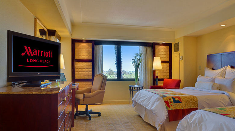 A modern hotel room with a large window, a flat-screen TV on the left wall, a bed with a colorful quilt in the center, and a chair with a wooden frame and red cushion in the foreground. The room has beige walls, a beige carpet, and a wooden dresser with a mirror above it. There is a lamp on a small table next to the bed, and a vase with flowers on the dresser. | <b>Long Beach Marriott Room</b>. Images powered by <a href="https://leonardo.com/" title="Leonardo Worldwide" target="_blank">Leonardo</a>. | 56309bbec4be715d64b97573253d262c333af96b4b3fa3f47efaa8b19833e07a | 000720951107 | 0 | 0 | 74 | 12 | 0 | 0 | |