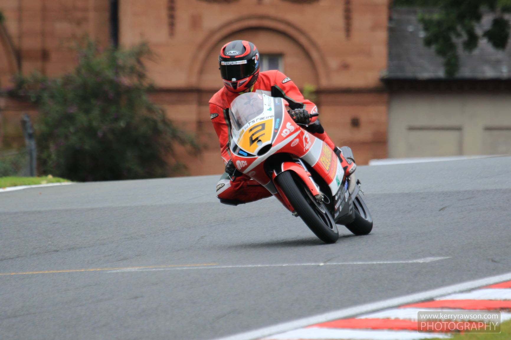 A person in a red racing suit is riding a motorcycle on a racetrack. The motorcycle has a number 17 on its side and is positioned on the right side of the track. The rider is wearing a black helmet with a red stripe and is leaning into a turn. The background features a red brick building with a large arched window and a green tree to the left. | Jake Archer Motostar Oulton Park Sept 20 | 86a93f85396042de782baf7dc6818850f4c252a31b034190b86d00a5b4a9efe0 | 000720951090 | 0 | 0 | 69 | 7 | 0 | 0 | |