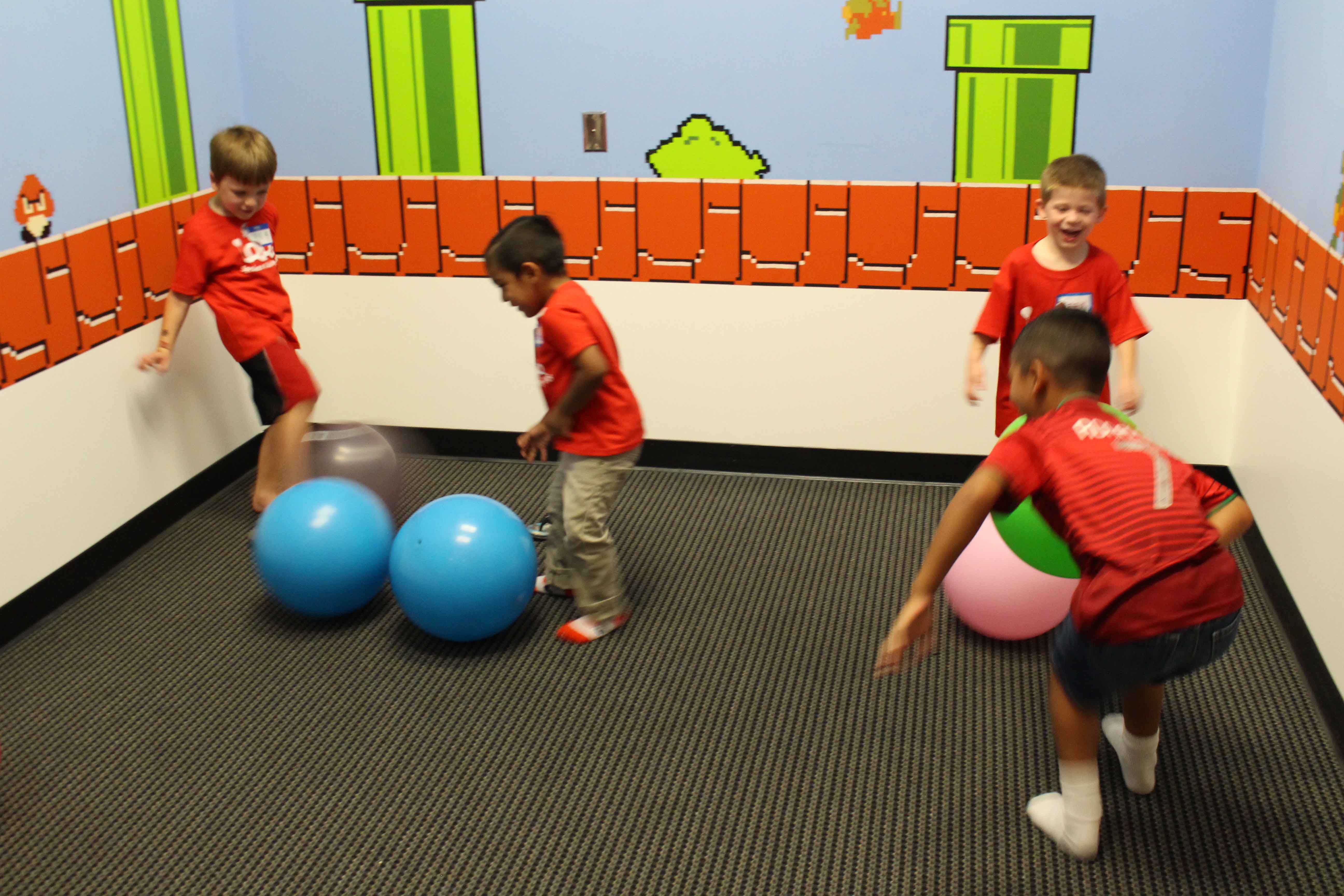 A group of children in red shirts are playing with colorful balls in a room with a carpeted floor. The walls are decorated with a Mario-themed mural featuring characters like Mario, Luigi, and Princess Peach. The children are engaged in a game, with one child in the foreground reaching out to a ball. | Kids Day Ball Room | 24792a1e0bfd65ef25ba8c068c030b29b93cc6dafc1064934cc3149c03eeb5c5 | 000720951049 | 0 | 0 | 53 | 4 | 0 | 0 | |