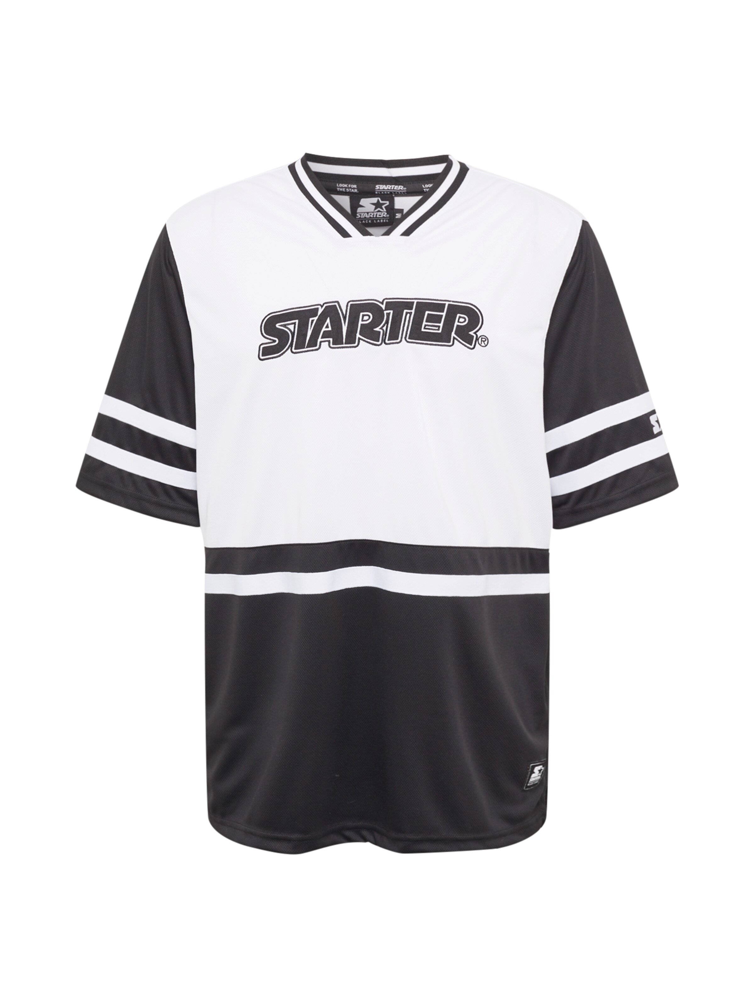 A black and white baseball jersey with the word 'STARTER' in bold, stylized letters across the chest. The jersey has a collar with a tag, and the sleeves have black stripes. The jersey is displayed against a white background with a plain, light-colored surface beneath it. | Starter Black Label Shirt in Black: front | 6a03b3cd4960301a269699783a611e4ea01b2d2c769c1905bd057cc1d7fafb24 | 000720951225 | 0 | 0 | 46 | 7 | 0 | 0 | |