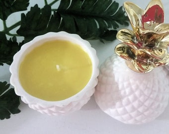 A white ceramic pineapple-shaped candle holder with a golden pineapple design on top is placed on a white surface. The candle inside the holder is lit, casting a warm glow. Surrounding the candle holder are green leaves, adding a touch of nature to the scene. | Hand-Poured Pineapple Candle | 215fe33bc2ca60cabbc46293a5bbea85eba08b579d91a4e2cf652cda1110ba40 | 000720951057 | 0 | 0 | 45 | 3 | 0 | 0 | |