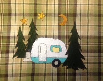 A patchwork quilt with a green and brown plaid pattern, featuring a white camper van with a blue stripe and a yellow star on the roof, surrounded by green pine trees and a crescent moon and stars in the sky. | Camper Sweet Camper Applique PDF Pattern for Tea Towel | d825292868205e1da1b1b0cdf1efd590c581fd61ec4dcf14734ef2beb6df351c | 000720951320 | 0 | 0 | 40 | 9 | 0 | 0 | |