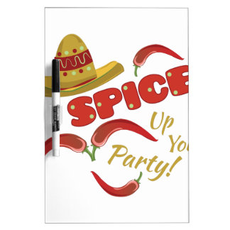 A white poster with a black marker on the left side, featuring the word 'Spice' in red with a yellow outline, surrounded by red chili peppers and a sombrero hat. The poster has a festive and colorful design, with the phrase 'Up Yo' Party!' written in a playful font at the bottom. | Spice Party Dry Erase Board | 5a59ee8b86e8c58923230577e8971580e7262b888581fc87e6febb868bd10dbf | 000720951396 | 0 | 0 | 52 | 5 | 0 | 0 | |