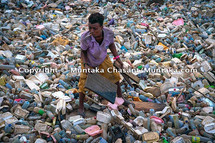 A person is standing amidst a large pile of various plastic items, including bottles, bags, and other waste. The person is wearing a purple shirt and yellow shorts, and is holding a wooden plank with their right hand. The scene appears to be a garbage dump or a similar environment where waste is accumulated. | Plastic Pollution and Urban Poverty | f549b7b060e4b14597407f8d99c36563985d0374af218881680039959d0350ff | 000720951341 | 0 | 0 | 54 | 5 | 0 | 0 | |