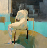 A painting of a nude woman sitting on a wooden chair in front of a window with a view of a building and a tree. The woman is facing away from the viewer, and her hair is long and dark. The painting has a textured, brushstroke style, with a palette of blues, greens, and browns. The woman's skin is depicted with a gradient of light to dark, and the chair is a simple wooden structure with a curved backrest. | Nude with blackboard. by ScottBridgwood | 62ad34ef1cf9cdcc36973946625b1d6d4a5e7ab4e5c00c3f1cd2b08602b12ab3 | 000720951904 | 0 | 0 | 79 | 5 | 0 | 0 |