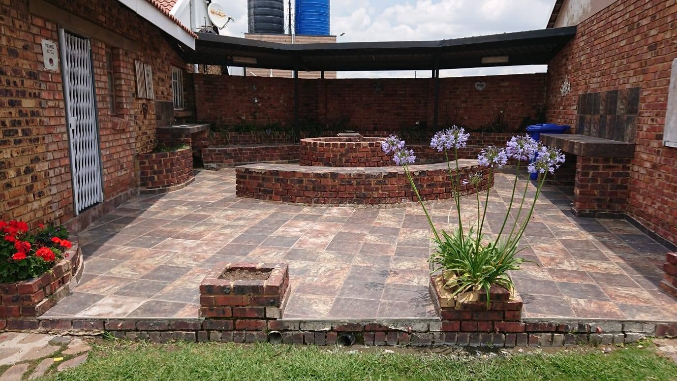 A small patio area with a brick floor and a variety of plants. There are two potted plants with red flowers, one on the left and one on the right. In the center, there is a circular brick planter with a tall plant with purple flowers. The patio is surrounded by a brick wall with a few windows and a door. Above the patio, there is a metal roof structure with a blue barrel and a white bucket. The sky is visible through the roof, showing a few clouds. | House For Sale in Heilbron Rural | a188fbae04233d0e7ff0251bed12844c30a3ae2d8886156df6eff73bfe9fbd16 | 000720951730 | 0 | 0 | 89 | 6 | 0 | 0 | |