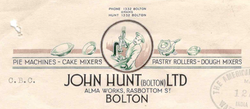 A vintage advertisement for John Hunt Ltd. featuring a circular logo with a woman in a hat and a man in a hat, surrounded by various food items such as pies, cakes, and doughnuts. The text reads 'PIE MACHINES CAKE MIXERS PASTRY ROLLERS DOUGH MIXERS' and includes the address 'ALMA WORKS RASBOTON ST. BOLTON'. The image has a worn and aged appearance with creases and a torn edge. | JH Logo 1937 | 1edb800390a43642f901990997b7ddb072cba572a30fb17e1a4271803635a227 | 000720951826 | 0 | 0 | 68 | 3 | 0 | 0 | |