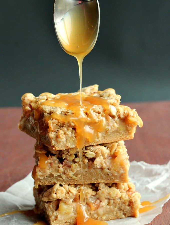 A stack of three square-shaped bars with a caramel topping is placed on a piece of parchment paper. A spoon is pouring a golden liquid, which appears to be honey, over the top of the bars. The honey is dripping down the sides of the bars, creating a shiny, sticky appearance. The background is a dark, gradient color, and the overall lighting is soft and diffused. | Apple Crisp Blondies | bbfefbd41c0f93fb02ac8ba8a71e5511536db55f3571458eacd46f00c2bb200f | 000720951892 | 0 | 0 | 66 | 3 | 0 | 0 | |