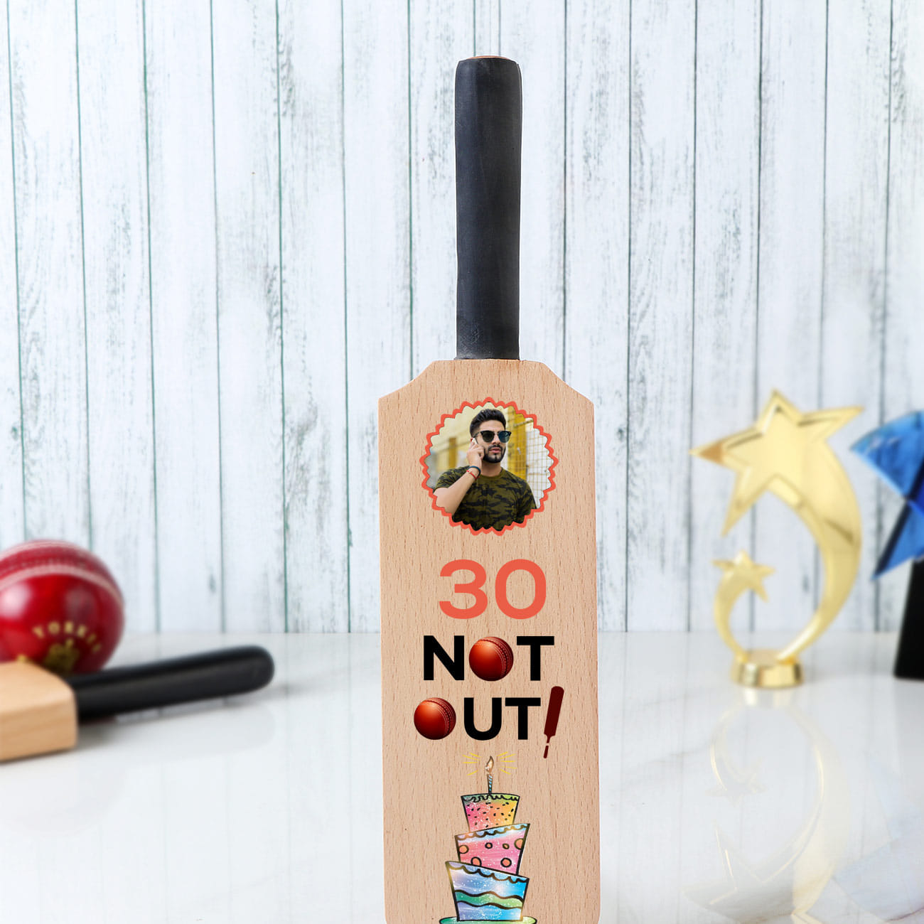 A cricket bat with a wooden handle and a brown, textured surface is displayed against a white background. The bat has a sticker with the text '30 NOT OUT!' and a cartoon character of a man in a cricket uniform. The bat is placed on a surface with a cricket ball and a bat-shaped decoration in the background. | Gift Birthday Personalized Cricket Bat Photo Stand | 8f3d8c87c1c158ca61fc301eb1e46acfe1e0cb7771b2f18413426eb9be7768e5 | 000720951973 | 0 | 0 | 58 | 7 | 0 | 0 | |
