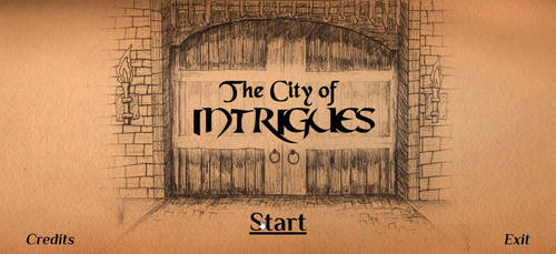 A hand-drawn illustration of a door with the title 'The City of Intrigues' written above it. The door is depicted with a wooden texture and has a large arched top with a cross design. Below the title, the word 'Start' is written in bold letters, and there are two 'Credits' labels at the bottom left corner. The image has a sepia tone, giving it an old-fashioned look. | The City of Intrigues - Interactive Fiction Game by iamjcat | 16258756ef409757cd68304b7c84460e93ba41a09da63712ac7b6b6fdf8902e0 | 000720950572 | 0 | 0 | 67 | 10 | 0 | 0 | |
