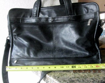 A black leather briefcase with a zipper closure is placed on a surface with a ruler underneath it. The ruler has markings for inches and centimeters, and the briefcase is positioned so that the ruler is visible beneath it. | Vintage large leather briefcase black shoulder strap pockets laptop pads | 4a6bd8eeaf19242e766005a8030097fc11f0bb9c01b5d4bb26b3f5b5243be259 | 000720952013 | 0 | 0 | 39 | 10 | 0 | 0 | |