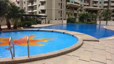 A blue swimming pool with a large leaf design on the bottom is surrounded by a white building with balconies. There are palm trees and a building with a curved roof in the background. The pool has a blue deck with a white border, and there are no people or pool furniture visible. | Gallery Cover Image of 1330 Sq.ft 2 BHK Apartment for rent in NCC Nagarjuna Maple Heights, Mahadevapura for 25000 | 6dc520eac20eb68e1de8fcc768727dbdbafa865f71173f514590136407b8a15c | 000720952022 | 0 | 0 | 53 | 19 | 0 | 0 | |