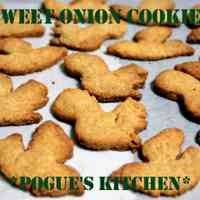A collection of golden-brown cookies with a heart shape and a pattern resembling a bird's wing is spread out on a surface. The cookies are arranged in a way that suggests they are part of a larger design, possibly a bird or a flock of birds. The image is titled 'Wheaton Onion Cookie' and 'Pogue's Kitchen' at the bottom. | New Harvest Sweet Onion Sabl\xc3\xa9 Cookies | a0be874cd9c795129a86b73fe9a1a606310de10d6bde20a4e68e6481186a2cb1 | 000720951926 | 0 | 0 | 59 | 6 | 0 | 0 | |