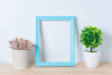 A blue picture frame with a white mat is placed on a wooden surface. To the left of the frame, there is a white vase with a succulent plant. To the right of the frame, there is a white vase with a green, round, bushy plant. The background is a plain light blue wall. | mock up frame photo in room.home decoration | 8b61f19e62692b8c52b376984694c1d73dc12509c190e2aefef04deeecaa8c27 | 000720951978 | 0 | 0 | 54 | 7 | 0 | 0 | |