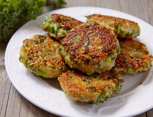 A plate of four golden-brown, crispy fritters with a slightly charred appearance, garnished with green herbs, is placed on a wooden surface. The fritters are arranged in a square formation, with each piece slightly overlapping the one next to it. The plate has a decorative edge and is set against a blurred background that suggests a rustic or natural setting. | Quinoa Kale Fritters | 2effa224a9511990fab804d129145ad5cf7d44c819466e331e941e5190fa2527 | 000720952162 | 0 | 0 | 60 | 3 | 0 | 0 | |