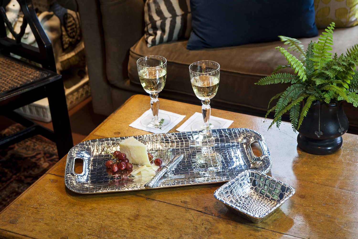 A silver tray with a wedge of cheese and a bunch of grapes is placed on a wooden table. Two wine glasses are standing next to the tray, and a small silver bowl is also on the table. In the background, there is a couch with a striped pillow and a fern plant in a black pot. | Croc Long Rectangular Tray / Set of 2 | 1b59992d5c4ff4ca99699870bdd052a7252058596e745c780cd1957febb03e45 | 000720952060 | 0 | 0 | 57 | 8 | 0 | 0 | |