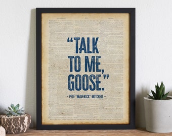 A framed picture of a newspaper page with the headline 'TALK TO ME, GOOSE.' in blue and white text, with a quote attributed to 'PETE MAVORICK MITCHELL' below it. The frame is black and the newspaper page has a vintage look with a beige background. The picture is placed on a wooden surface, and there are two potted plants, one on each side of the frame. | Talk to me Goose Poster | Top Gun Quote Print | Movie Quote Poster | b773e30864c7c4c2310e8bdb886d3e2d0d23472d6e86a21e1e23243741c4a8cd | 000720952170 | 0 | 0 | 66 | 14 | 0 | 0 | |