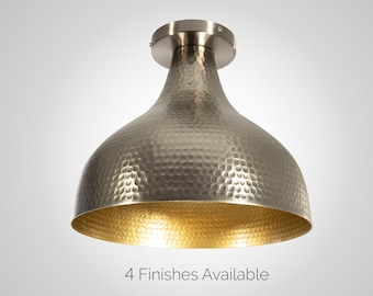 A modern lamp with a textured metallic finish and a rounded, bulbous shape. The lamp has a single light source at the top, emitting a warm, golden glow. The background is a plain, light color, and there is text at the bottom that reads '4 FINISHES AVAILABLE'. | Cotswold Hammered Flush Mount Light Fixture | 69637d458607bf447a4862cab3b8bc9c5f72a551fa6079f8321267a9330c9ba0 | 000720952216 | 0 | 0 | 47 | 6 | 0 | 0 | |