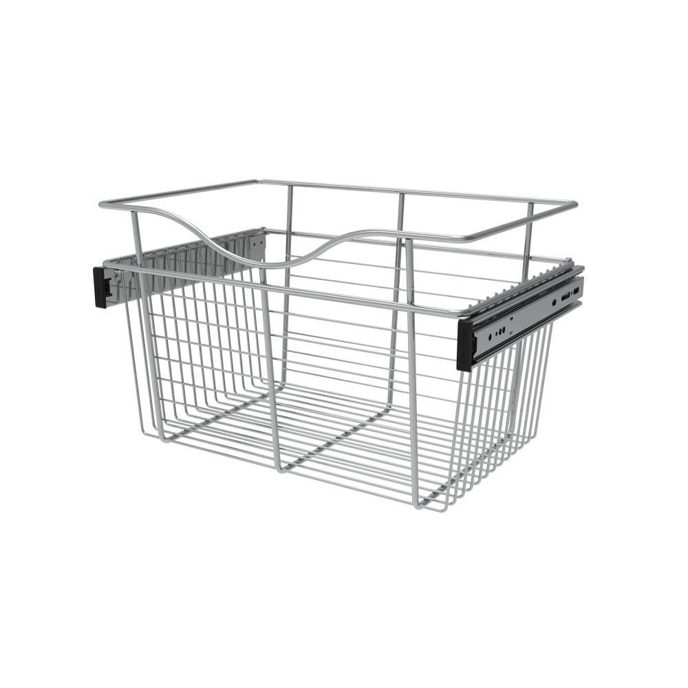 A modern, sleek metal mesh organizer with a curved top and a flat bottom, designed to hold a laptop and other small items. The organizer has a black handle on the right side and is set against a white background. | Rev-A-Shelf 18 in. x 11 in. Chrome Closet Pull-Out Basket | 30040342fe2f7245b38e5a0cc6dd23358c3243e2fb7825a13c31b82b48791597 | 000720952166 | 0 | 0 | 40 | 10 | 0 | 0 | |