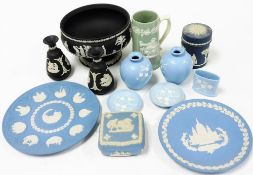 A collection of various ceramic items is displayed on a white background. The items include a large blue bowl with a black and white pattern, a smaller black and white vase, a green vase with a white pattern, a blue vase with a white pattern, a small blue and white vase, a blue and white vase with a white lid, a small blue and white vase with a white lid, a blue and white vase with a white lid, and a blue and white vase with a white lid. There are also two blue and white plates, one with a white flame design and the other with a white bird design. | A group of Wedgwood Jasperware, to include mainly blue Wedgwood Jasperware collectors plates, trinke | 344999d0d613ffb1d49ae490a721fb69a0b27c1c9badc127740acf6a7f8b17da | 000720951862 | 0 | 0 | 111 | 14 | 0 | 0 | |