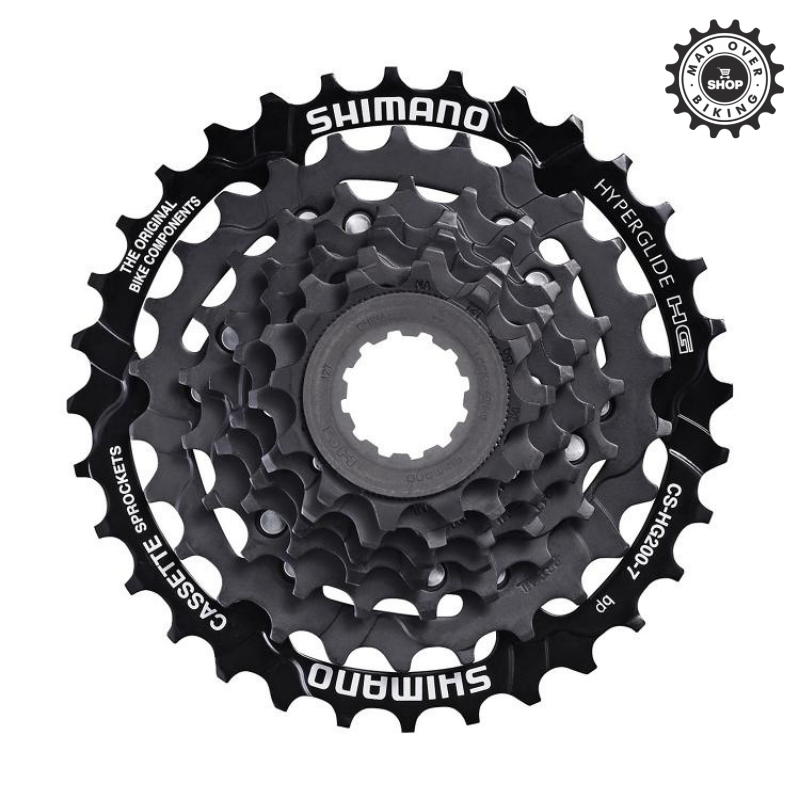A close-up image of a Shimano bicycle chainring with the brand name 'Shimano' and the model name 'Dura-Ace' visible. The chainring has a black color with a textured surface and is mounted on a hub. The image is well-lit, highlighting the details of the chainring. | SHIMANO Cassette 7 Speed 12-28T CS-HG200 | 253ebd0d6520e99b4c6733dcddce4d3e1cd0f5efb4ed8c528d0559c86bfc67c6 | 000720952270 | 0 | 0 | 45 | 6 | 0 | 0 | |