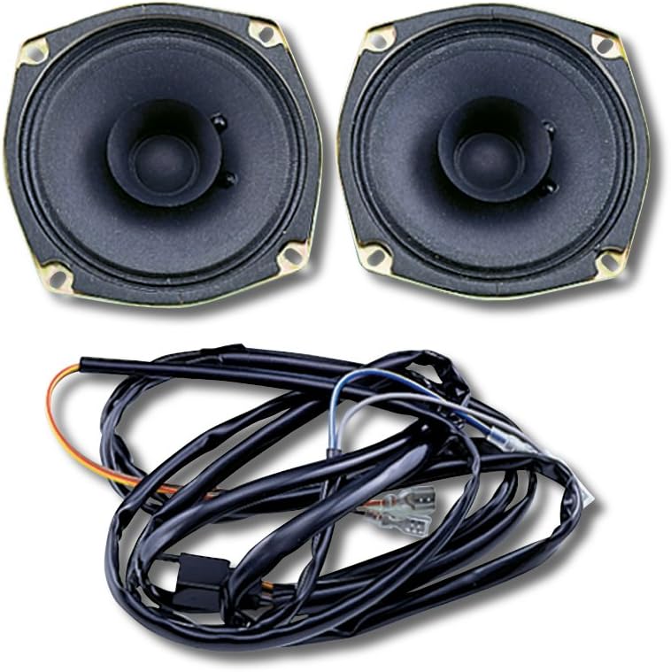 A pair of black speakers with gold accents and a blue wire with multiple connectors are displayed on a white background. | 52-607 Rear Radio Speaker Kit Show Chrome Accessories | d202a5e46c770e63b74e43c4261592502f3c48d0f29f739e43a062f4da799b4c | 000720952429 | 0 | 0 | 21 | 8 | 0 | 0 | |