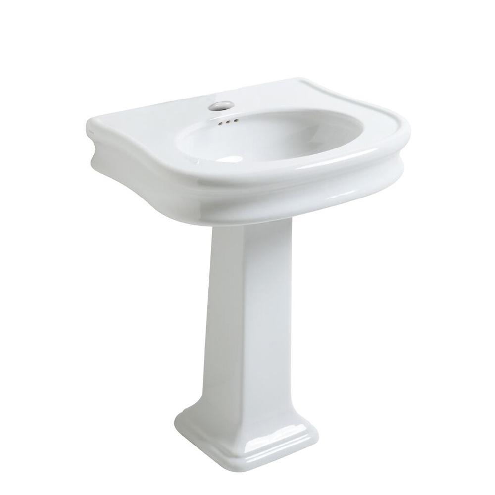 A white porcelain sink with a smooth, glossy finish and a simple, classic design. The sink has a single hole for a faucet and is mounted on a white pedestal base with a curved, tapered shape. The sink is set against a white background, highlighting its clean lines and minimalist aesthetic. | Isabella Collection 27-1/2 in. Traditional Pedestal Combo Bathroom Sink with 1-Hole in White | 5727fc7387455829e67aadd147bbb16e21f1eff8861109b699d453e99053ffba | 000720952399 | 0 | 0 | 51 | 13 | 0 | 0 | |