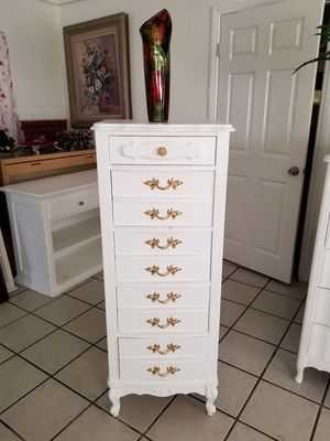 A white dresser with gold accents is placed in a room with tiled flooring. The dresser has a tall, slender vase with red and green leaves on top. The room has a white door and a framed picture on the wall. | Dresser tall 5 drawers for Sale in Hemet, CA | 9e6dabc7240c0c2adaa1b39eb32830493656dd8d43964f2b56d3d4ffae62626d | 000720952248 | 0 | 0 | 41 | 9 | 0 | 0 | |