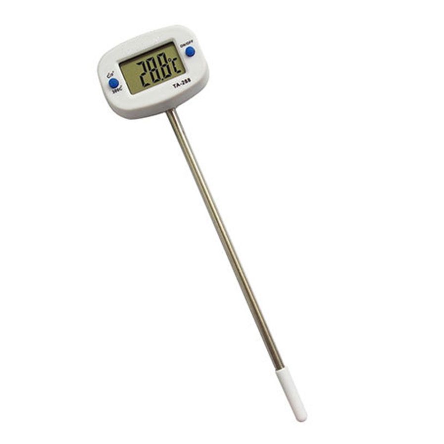 A digital thermometer with a white and blue display showing a temperature of 28.8\xc2\xb0C is attached to a metal probe. The thermometer has a white casing and a blue button. The probe is metallic and appears to be made of stainless steel. The background is a plain white surface. | Rotatable Digital Food Thermometer BBQ Meat Chocolate Oven Milk Water Oil Cooking Kitchen Thermometer Electronic Probe | 49d7c8e711e0692d2b9832f8e889202c4944cd6848469cd67363672a216d7b31 | 000720952431 | 0 | 0 | 49 | 16 | 0 | 0 | |