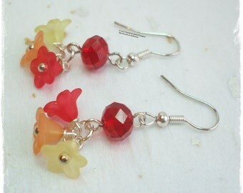 A pair of earrings with red and yellow flower-shaped beads and red gemstone drops. The earrings are attached to a silver earring hook and have a textured surface. The background is a white surface with a few specks and a small black mark. | Lucite flower earrings, Red flower earrings, red crystal earrings, posy earrings, bunch of flowers earrings, tiny flower earrings | c0a6097247f59e5641581aafaa092f76f910f1a29ab69b0774c002647a7fd9dc | 000720952676 | 0 | 0 | 43 | 18 | 0 | 0 | |