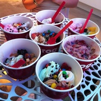 A round table with six bowls of ice cream, each with a different flavor and toppings. The bowls are placed in a circular pattern, with the first bowl on the left containing a mix of ice cream and chocolate chips, the second bowl with a scoop of vanilla ice cream and a cherry on top, the third bowl filled with a mix of ice cream and M&M's, the fourth bowl with a scoop of chocolate ice cream and a cherry on top, the fifth bowl containing a mix of ice cream and M&M's, and the sixth bowl with a scoop of strawberry ice cream and a cherry on top. There are red plastic spoons | Photo taken at Frog Frozen Yogurt Bar by Luciana N. on 9/7/2012 | 8b9dc500d77bfad4baf9064e211ca08ed138057c09917afaf174c296fd4d65d8 | 000720952707 | 0 | 0 | 114 | 12 | 0 | 0 | |