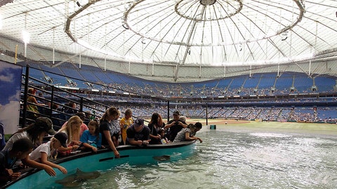 A group of people are observing a shark in a large aquarium. The shark is swimming near the bottom of the tank, which is surrounded by a crowd of spectators. The audience is seated on a boat-like structure that is floating on the water's surface. The tank is housed within a stadium-like structure with a large dome roof, and the spectators are seated in rows, some wearing hats. The scene is illuminated by artificial lighting, and the atmosphere appears to be that of a public event or exhibition. | Tropicana Field - St. Petersburg, Florida | 6c8c504c265b21c0dbffd3c0fba481ffeae33f4aa05478fdf55b54ec15731c75 | 000720952970 | 0 | 0 | 88 | 6 | 0 | 0 | |