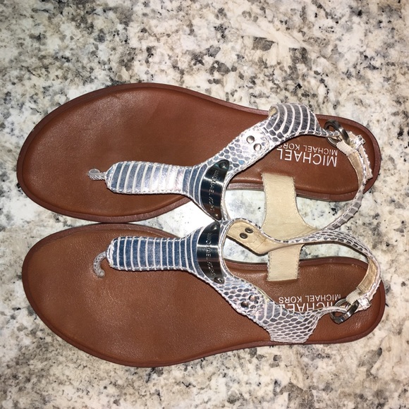 A pair of brown leather sandals with silver metallic straps and buckles is placed on a marble countertop. | fc2dbcfd0 Michael Kors thong metallic snake print sandal. M 57e81b7e522b4557b200b8e7 | 57b6e0c9bfc1f321303b644c056f5145675b9032033363c08bfa9e49f242b7ca | 000720953007 | 0 | 0 | 18 | 10 | 0 | 0 | |