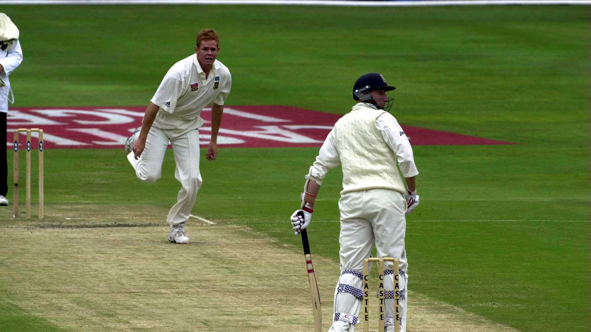 A cricket match is in progress on a grassy field with two players in white uniforms. One player is holding a cricket bat, and the other is holding a cricket ball. There are three cricket stumps and two bails on the ground. The background shows a red advertisement board with the word 'Coca-Cola' written on it. | Shaun Pollock Masterclass | f5e982bdef64b47080e9642851d63235a98f9b30448f03a6b6b289173bedbc44 | 000720952930 | 0 | 0 | 56 | 3 | 0 | 0 | |