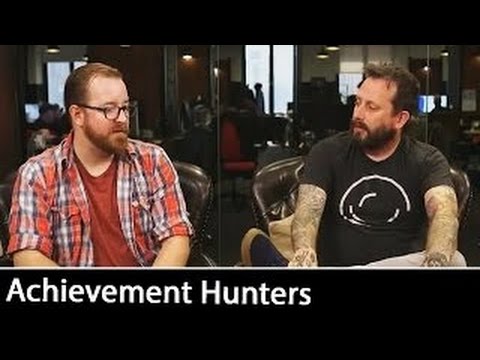 The first image shows two men sitting in a room with a wooden panel background. The man on the left is wearing a plaid shirt and glasses, while the man on the right is wearing a black t-shirt with a circular design on it. Both men have facial hair, with the man on the left having a beard and the man on the right having a goatee. The image is captioned 'ACHIEVEMENT HUNTERS'. | 'Achievement Hunters': Geoff Ramsey & Jack Pattillo (Interview) | October 2016 | 9931e4b0f184fbe9a1265aee51a41012d1a77f7b629a5d8f24958022c33d93e1 | 000720953038 | 0 | 0 | 73 | 11 | 0 | 0 | |