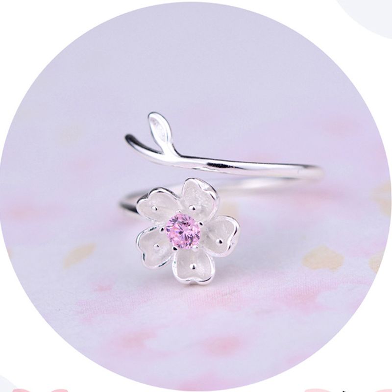 A close-up image of a silver ring with a pink gemstone in the center, surrounded by a white flower design. The ring is placed on a surface with a pink and white floral pattern. The image is circular, with a soft-focus background that complements the ring's design. | New Design Cherry Flower Ring Romantic Brass Ring For Women Ladies Girls Purple/Pink Color Adjustable | bc5ca2ddb9e4c792da6ec0a8b695d4c6955ffbf61e1f8baafb33d562b815a14d | 000720953086 | 0 | 0 | 47 | 15 | 0 | 0 | |