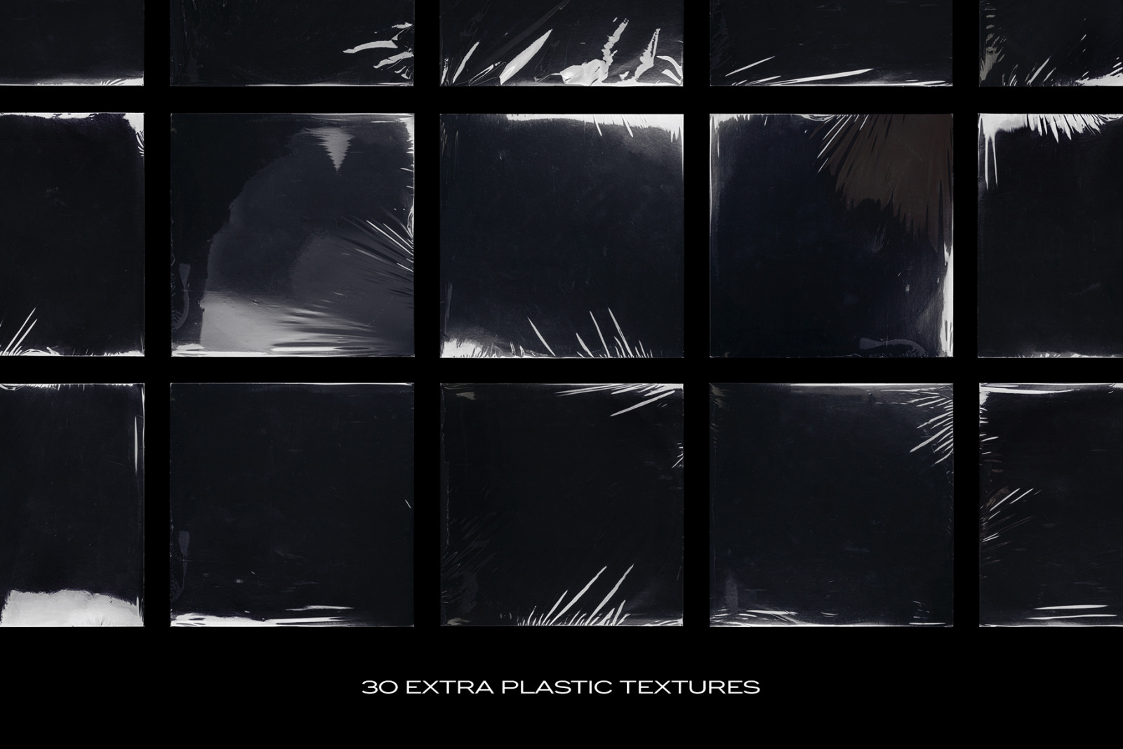 A collection of 30 extra plastic textures is displayed in a 6x5 grid. Each texture is presented in a square format, with some appearing more transparent than others. The textures vary in color and pattern, showcasing a diverse range of plastic materials. The image is captioned '30 EXTRA PLASTIC TEXTURES' at the bottom. | Plastic Wrap Texture Branding Bundle | 3a858f306e375737ef185248baf1215bc8ae9a6590629e7d050ef0fd4e5288de | 000720952133 | 0 | 0 | 53 | 5 | 0 | 0 | |