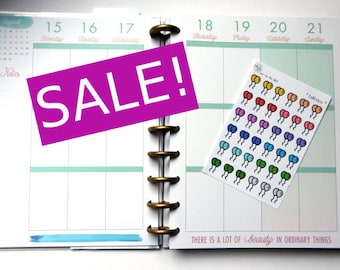 A calendar with the word 'SALE!' written across the top in large, bold letters. The calendar is open to the month of July, which is highlighted with a pink border. There is a small sticker with a row of colorful icons resembling flowers or plants on the right side of the calendar. The calendar is attached to a wall with a blue marker, and there is a blue marker on the left side of the calendar. | SALE - basics - balloons (EC, Happy Planner Stickers) | dddc7a0af2cd17280fb63b7088c7004e415111dbe61d2a4a0c4741143d06698c | 000720953101 | 0 | 0 | 76 | 9 | 0 | 0 | |