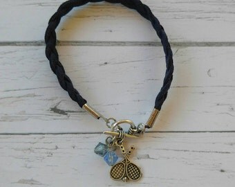 A black braided bracelet with a silver charm featuring a tennis racket and a blue gemstone is displayed against a white background. | Tennis Charm Bracelet// Custom Girl's Sports Bracelet// Tennis Gift// Tennis Mom// Tennis Coach// Choose Cord & Crystal Color | d3275324cbb8636629ba25ea7628b592df2ff03528d7ab62b91cb81c4de9fbd1 | 000720953215 | 0 | 0 | 22 | 18 | 0 | 0 | |