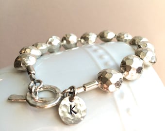 A close-up of a silver bracelet with a heart-shaped charm engraved with the letter 'K' and a small key charm attached to it. The bracelet is displayed on a white surface with a soft-focus background. | Personalized Hammered Silver Bracelet--Initial Bracelet | 643ad4aaad6862cc041f60b71511e7ffc72c96d2652bf90e12d21adb51c0e043 | 000720953316 | 0 | 0 | 35 | 5 | 0 | 0 | |
