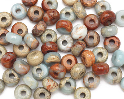 A collection of variously colored beads is spread out on a white surface. The beads come in a range of colors including red, brown, beige, white, and blue. Some beads have a glossy finish, while others have a matte texture. The beads are of different shapes and sizes, with some resembling marbles and others having a more irregular form. | Impression Jasper Rondelle (Large Hole) 5x8mm | 37a21113f8f62259599dfb2c0c941cfb0c47603a669f83ae9896cc36365b3ff4 | 000720953615 | 0 | 0 | 59 | 6 | 0 | 0 | |